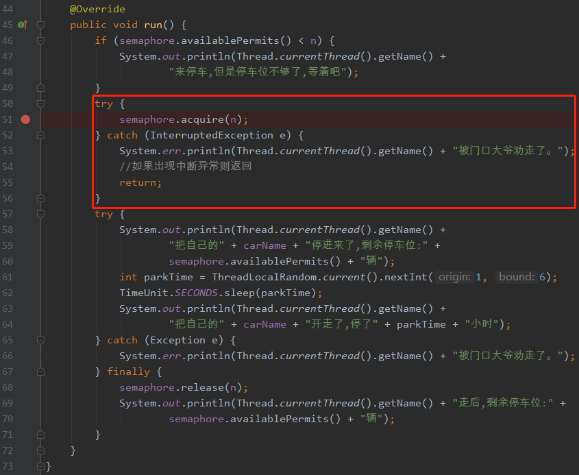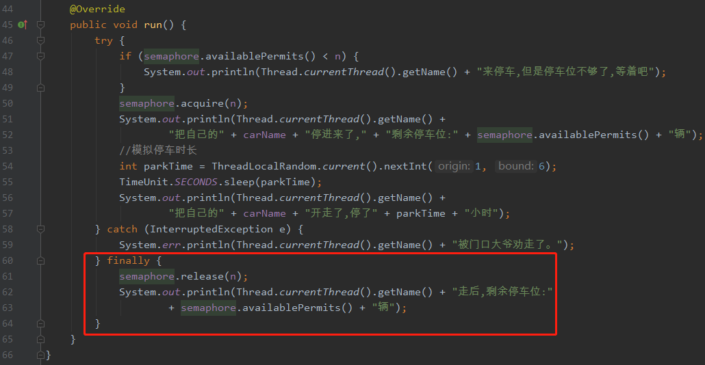 System.out.println(Thread.currentThread().getName() + "把自己的" + carName + "停进来了,剩余停车位:" + semaphore.availablePermits() + "辆");