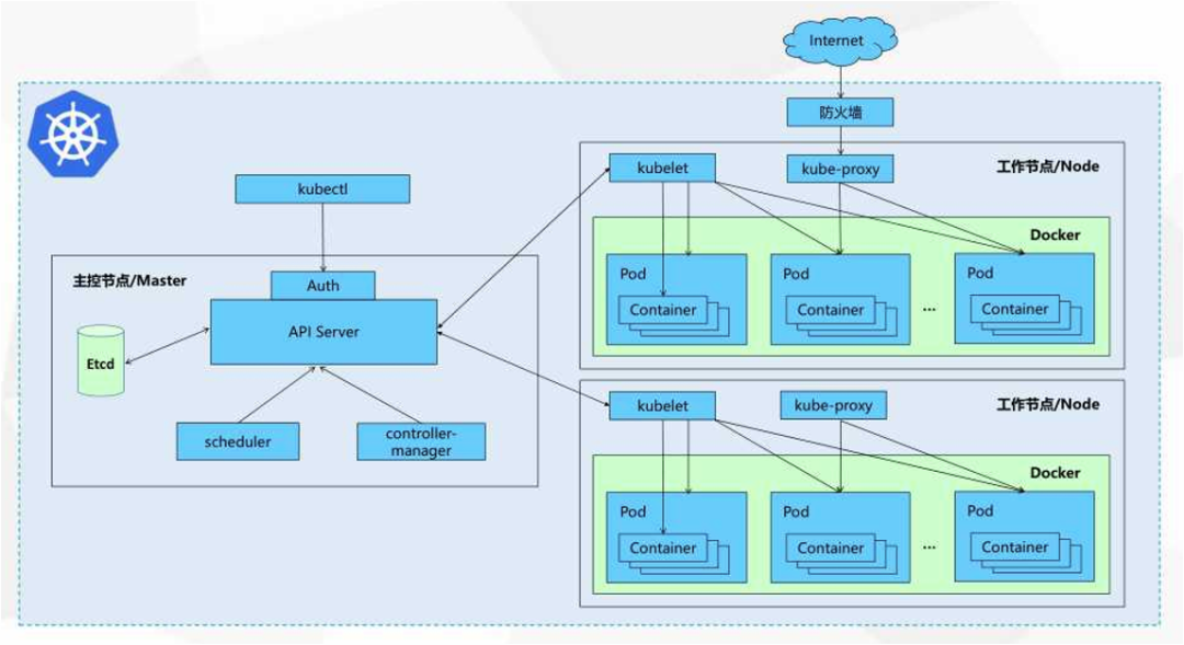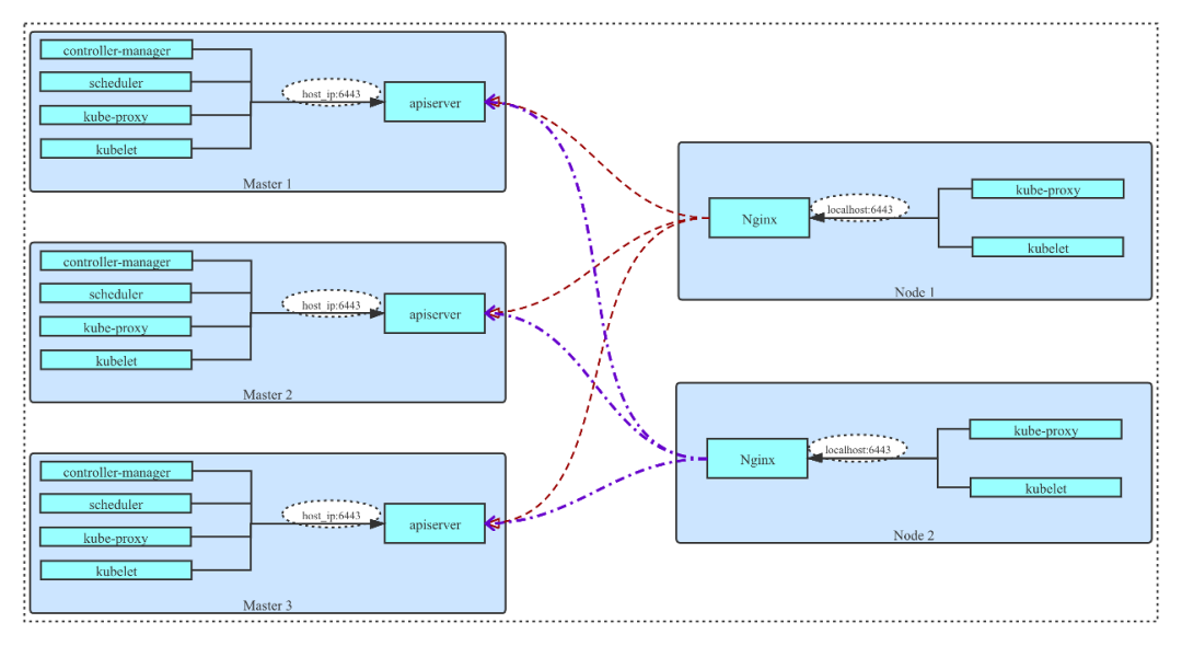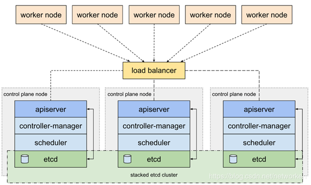在 API Server 之上有一个 load balancer,它是把多个 API Server 节点进行串联的关键组件。load balancer 的功能类似于 Nginx,会把 worker node 发送的请求代理到各个 API Server 上,把流量/请求全部分发过去,这样就可以实现 API Server 的 HA 功能