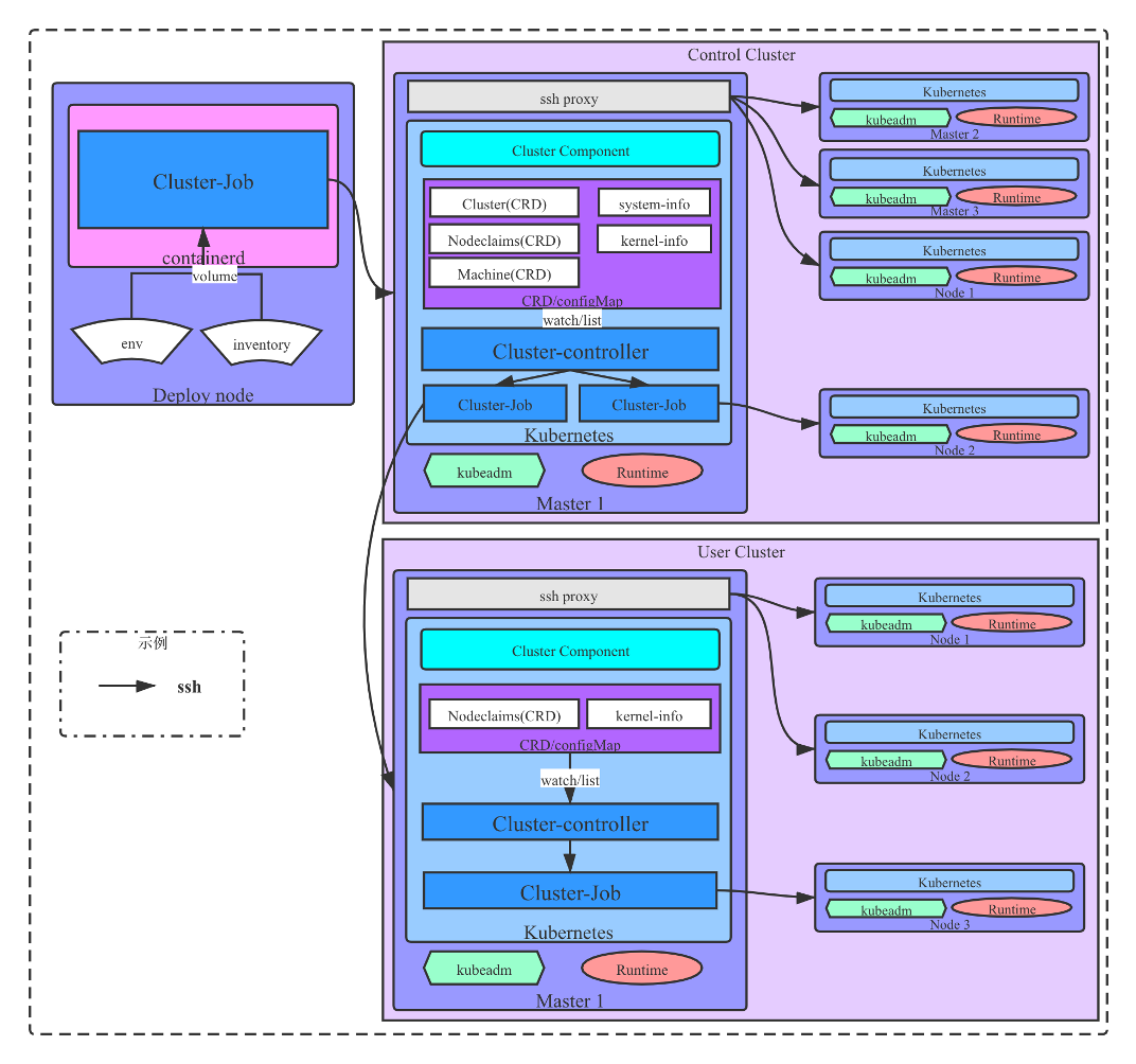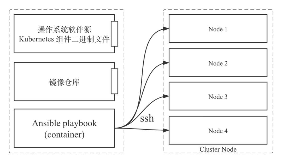 上面两个服务起来之后,我们会在这个节点或者服务器上启动另外一个容器——控制集群部署脚本。这个容器里的脚本是 Ansible playbook,会通过 SSH 的方式登录到集群的每个节点上进行部署操作