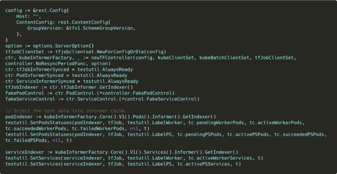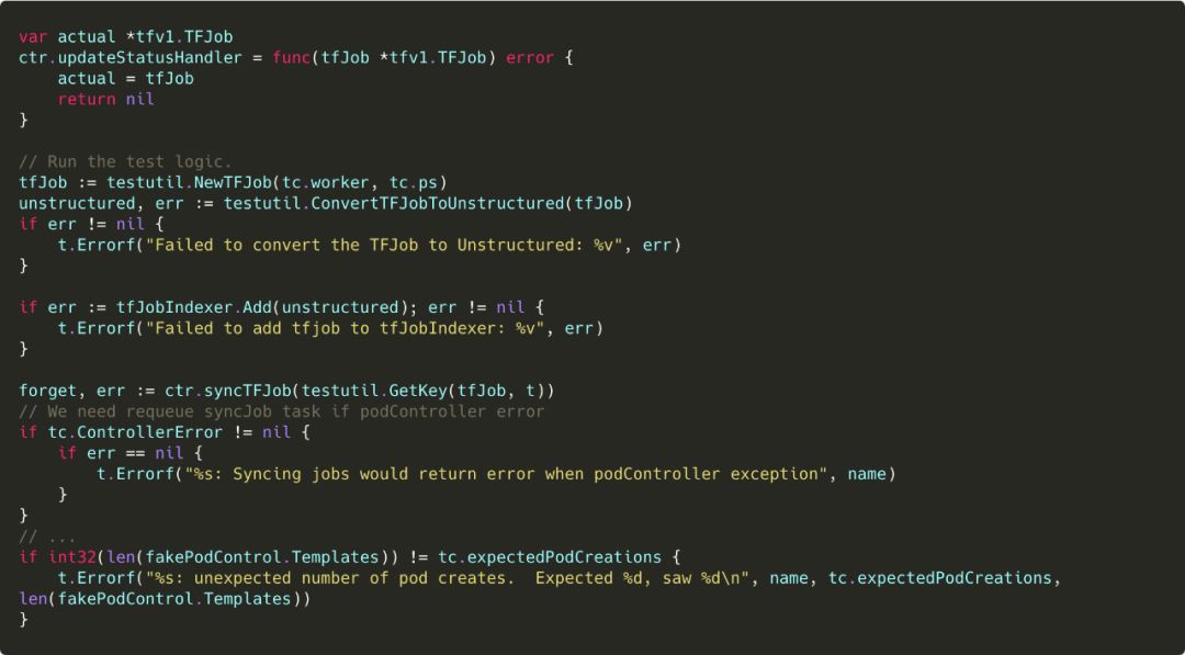 在 tf-operator 中,我们采取了跟 Kubernetes 内置的 controller 类似的测试方案(例子可见 job_controller_test.go)。