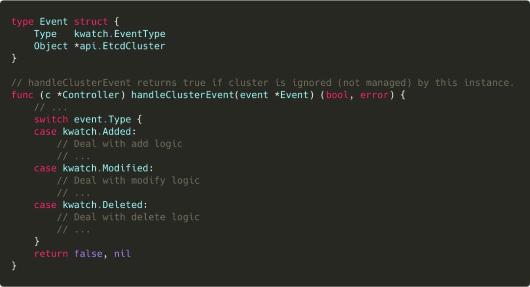 目前 etcd-operator 在实现中仍没有像主流的 Operator 一样,采用 Work Queue 的方式来避免阻塞问题,而是在 Informer 中直接进行处理,而它的处理逻辑则被统一写成了: