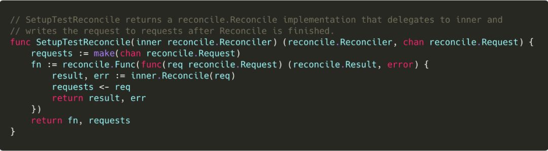 根据 Golang 的内存模型,不带缓冲的 Channel 的接收操作 happens-before 相应 Channel 的发送操作完成。利用这一特性,在同一个测试用例中,测试的对象可以被多次 Sync,每次 Sync 的状态都可以被检查。如果需要检查其中的 reconcile.Result 的值,如 Requeue 等,也可以改动这部分的逻辑来扩展。