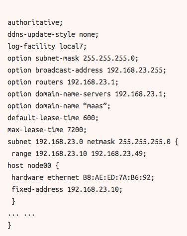 MAAS 可以直接对 DHCP 进行处理,所以我们不需要特地对它进行处理。然而默认设置的安装方法简单粗暴,所以你可能需要稍微进行调整。以下是一个 etc/dhcp/dhcpd.conf 文件,可以运行得更加顺畅。