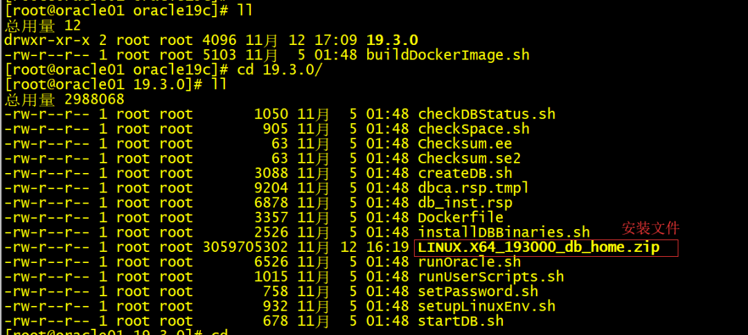 上传对应版本的 dockerfiles 和 buildDockerImage.sh 脚本到 docker 服务器上,下载[2]数据库安装文件 linuxx64__database.zip 文件,不要解压放到对应版本目录的 dockerfiles 目录下。