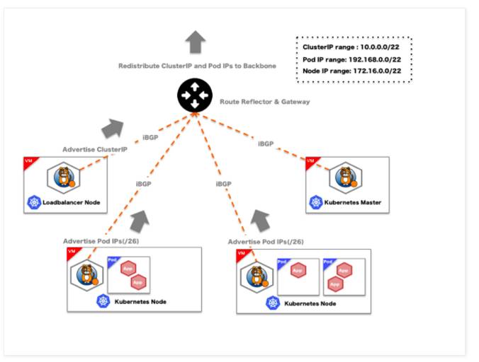 在 Calico 项目中,通过 BGP 运行在 BIRD 容器(OSS 路由软件)上,来broadcasting 产品IP。通过在容器化的 BIRD 上(BIRD 为一款 OSS 路由软件)运行 BGP,从而进行广播同步 IP 信息。默认设置下,它只会在集群内广播。我们通过在集群外设置对等路由器,它使得访问集群外部成为可能。