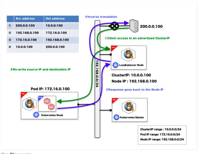 通过 Sky DNS 插件,在 Kubernetes 实现服务发现也是可能的。作为集群内部服务,它在集群中类似于 ClusterIP 一样可访问。通过 BGP 来 broadcasting ClusterIP,从集群外部命名解决工作。