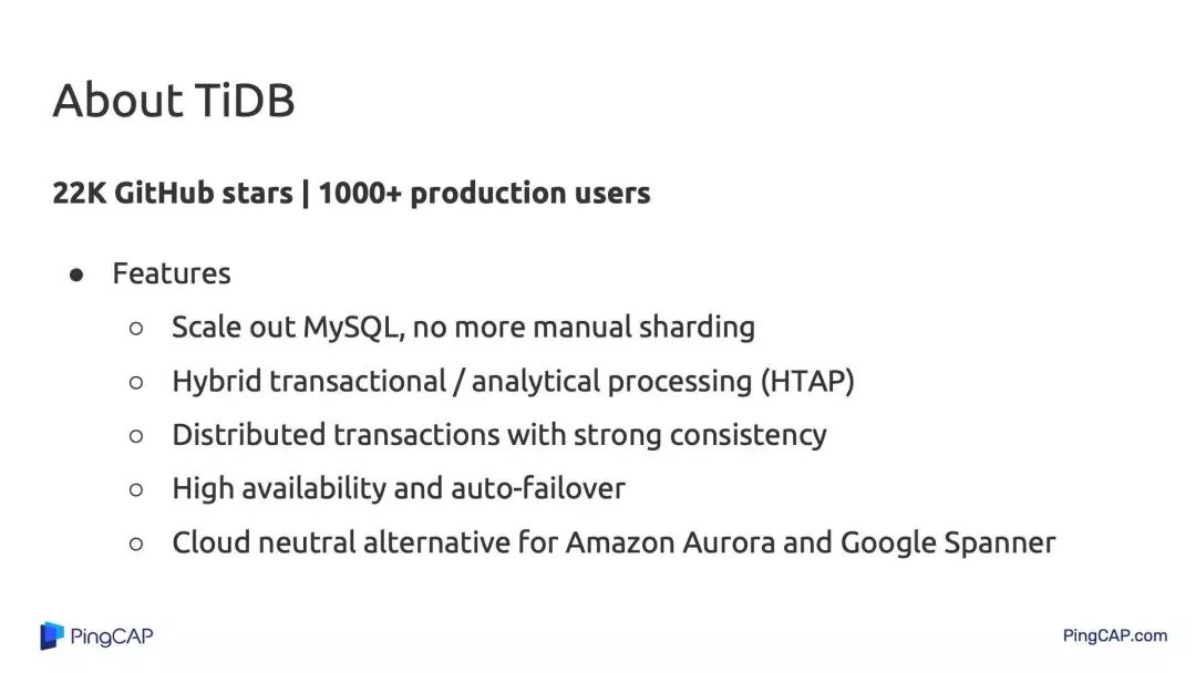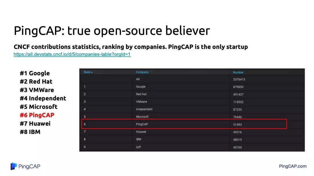 我们再来说 PingCAP 是一家什么样的公司?可能大家都知道 TiDB,不知道 PingCAP。其实 TiDB 是 PingCAP 开发的。那 CNCF 又是什么呢?CNCF 全称是云原生计算基金会。可能很多人知道 K8s 但是不知道 CNCF,就像大家知道 TiDB 不知道 PingCAP 是一样的道理,Kubernetes 是 CNCF 下面最火的一个项目。目前在整个 CNCF 所有代码贡献里面,PingCAP 在里面全球排名第六,在我们下面排名第七的是华为,前八名里面只有两家中国的公司。