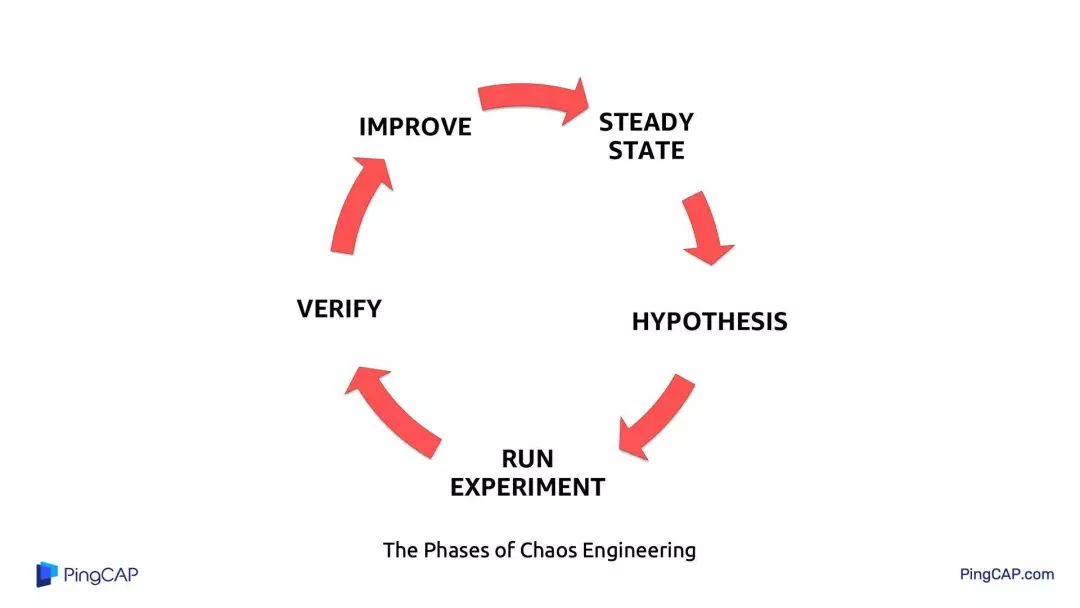 这方面历史上的先行者是 Netflix,他们创建了一个叫做 Chaos monkey 的东西,就是在整个系统里面,随机地去 kill,比如几百几千个冗余服务,随机 kill 掉一个,来看系统会怎么样。我不知道大家有没有人在线上真的做过这种测试,应该是没有的。之前我们提到过黑天鹅,当然不仅有黑天鹅还有墨菲定律,就是所有你觉得可能会出现的最后一定会出现。如果你自己不去 kill,它一定会被别人 kill 掉,各种意外都会有。这里面比较有启发的一件事是 Netflix 在 2014 年创建了一个新的岗位,这个岗位就叫 Chaos engineer,是专门有个工程师做这件事,在线上去随机 kill 节点。到时候大家很可能面临的情况是,可能某一天半夜,研发突然被全部拉起来,所有人同时在查问题,却不知道问题在哪里。大家第一反应是「这不是我的问题」,甩锅一定要快。到底谁的问题呢?其实老板不关心到底是谁的问题,关心的是能不能尽快找到以及什么时候可以恢复。那么这个系统会帮你非常大的忙。2019 年 12 月底,我们在 GitHub 上公开了这个项目,叫 Chaos Mesh,是目前 Star 数增长最快的一个项目之一。它的思想很简单,通常情况下你系统有一个正常状态,所有人都知道,在这个正常状态下,你就开始做一些假设,比如说 kill 掉一个节点,我觉得应该出现什么情况。然后你去做实验,根据我的经验,通常大家假设都是不对的,你假设kill 这个节点以后,系统还是稳定的,过几秒它就恢复了,或者对系统没有什么多大影响,或者会稍微抖动一下。这个假设很可能是不靠谱的,因为它也许开始影响别人,别人又可能继续影响其他服务,在系统里面就像塞车一样,你发现塞车,只要它塞过的地方就会一直在塞车。然后再去 verify 一下你刚才做的实验,你发现它是不靠谱的,然后去改进你的系统,再来一圈。这个思路很简单。