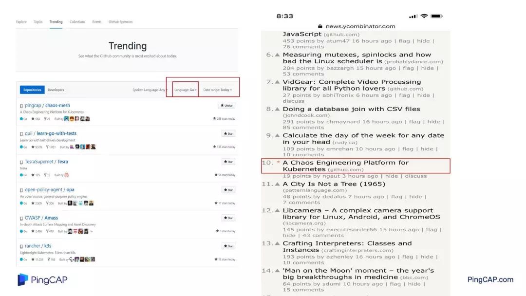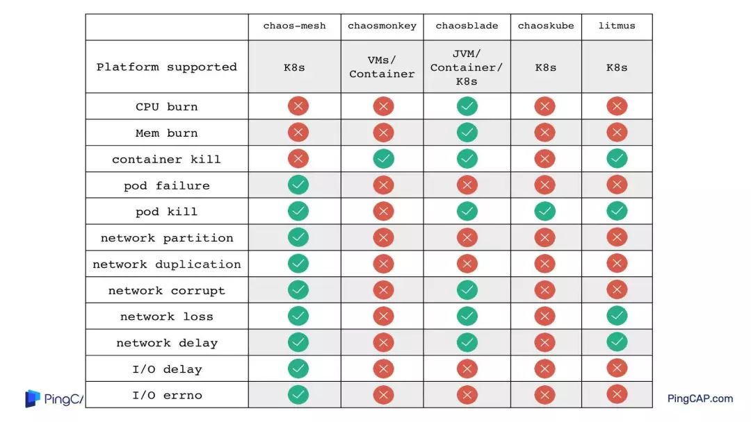 上图是我们开源之后的反应,马上就登上了 Go 语言的 trending 第一名,在 hacker news 上面也登上了首页,当时排名是第十。全世界人民都觉得这个很好,很欢欣很鼓舞,我们自己也是。其实大家都想发明一只猴子,这只猴子可能是一般的猴子,也可能是孙悟空,到底我们需要什么样的猴子呢?所以,在做这个系统前我们做了一个调研,我们自己做的 Chaos Mesh 有哪些功能,我们做了哪些事。