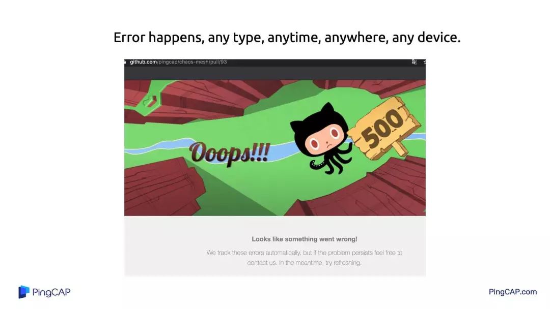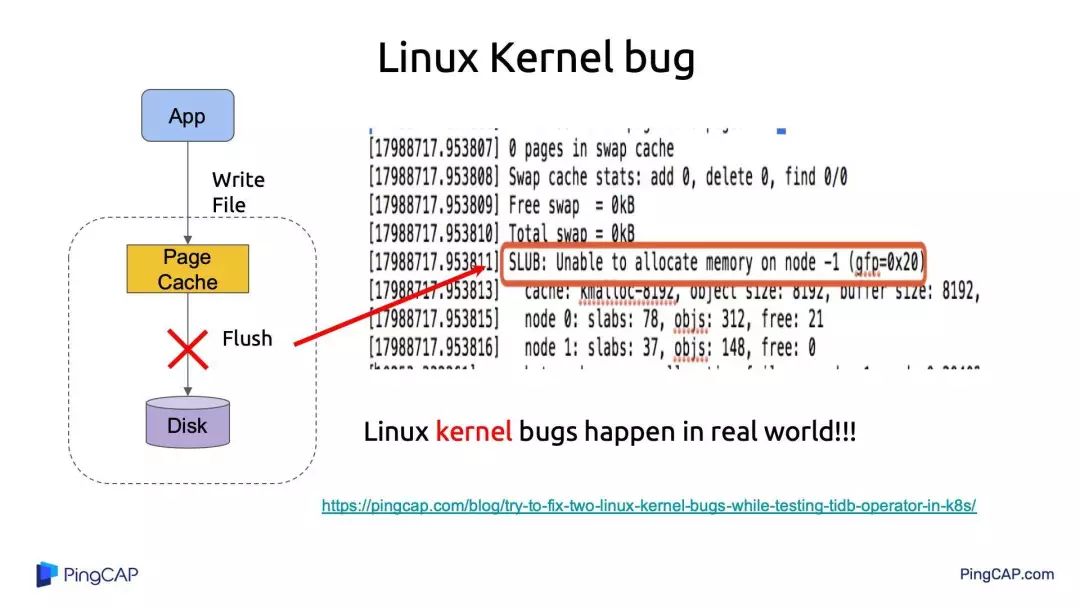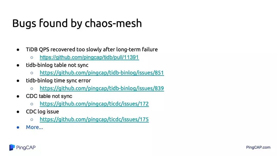 我们之前有个同事发了一条关于 Chaos Mesh 的朋友圈,他是这么说的,『以前我觉得自己写代码挺牛逼的』。我问了一句,『后来呢?』他说『不说了,连续几周都在修 bug』。相信我,大家的应用程序跑上来,不会有什么意外,都一样,因为你们从来没有测过这种情况,在这种情况下它的表现正常才奇怪,因为你都没定义这种情况正常是什么。大家有没有想过,你写进磁盘,在磁盘上读,读出来的数据不一样,程序什么表现?很可怕,有人程序没有挂,因为他自己写的东西他没有校验,写出来的数据在后面没有加一个校验符,下次读出来直接用了,天知道这是个什么结果。然后关键是它还没死,在系统里面接着跑,跑了以后影响别的,就像一个病毒在系统里面复制,结果是不可预期的。怎么办?这个系统都可以帮大家搞定。下面是我们自己找的一些 bug。