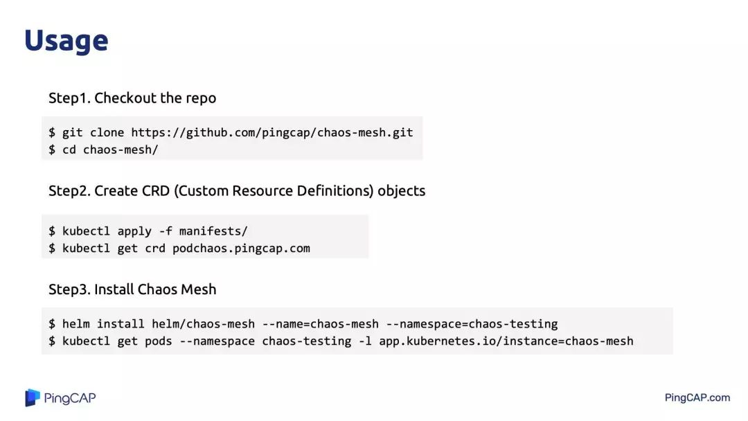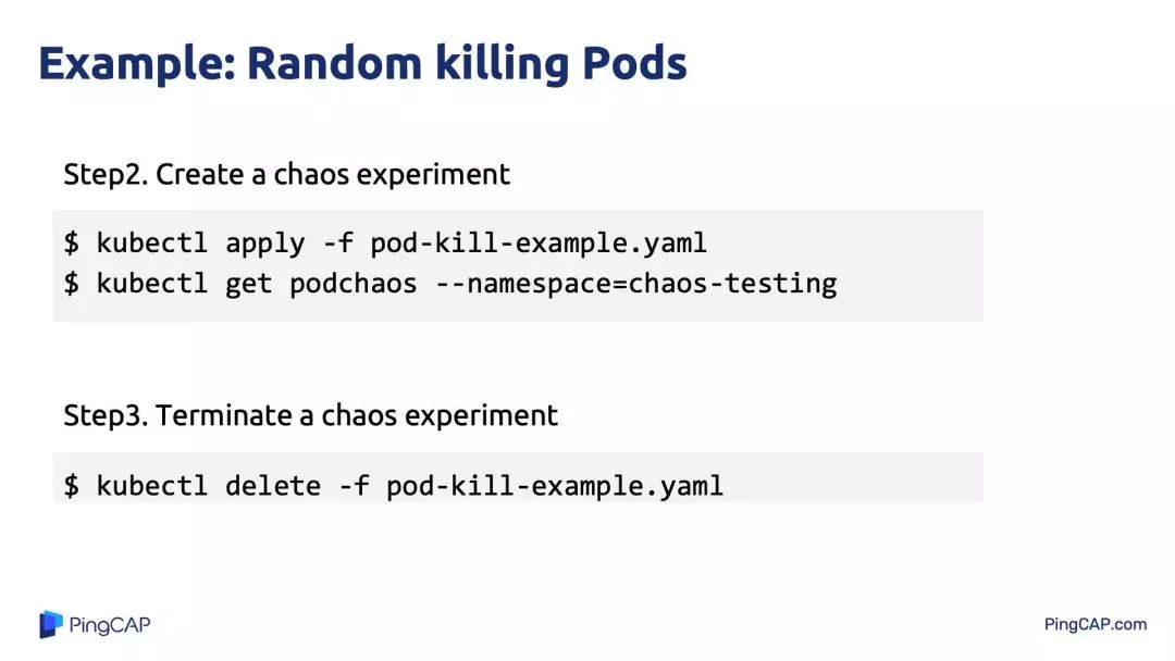 上图是它的用法,像一般的开源项目一样,先克隆下来,当然 K8s 有个好处,安装比较方便,三部曲就完了。完了以后就开始设定行为,比如说我整个系统里面想随机 kill 掉一些节点或者 kill 掉某一些节点,我应该怎么做,我选择我 kill 掉哪些标签的节点,kill 的方式什么样呢?每隔 2 分钟一次,这个配置很好理解。我们只要部署一下刚才的 YAML 文件就行,当我们不想做实验的时候,只要停掉整个实验,这个时候通常我们的系统应该是恢复的,这个时候是大家最紧张的时候,因为大概率你的系统是没有恢复的。这是我们的经验,总是能找到问题。
