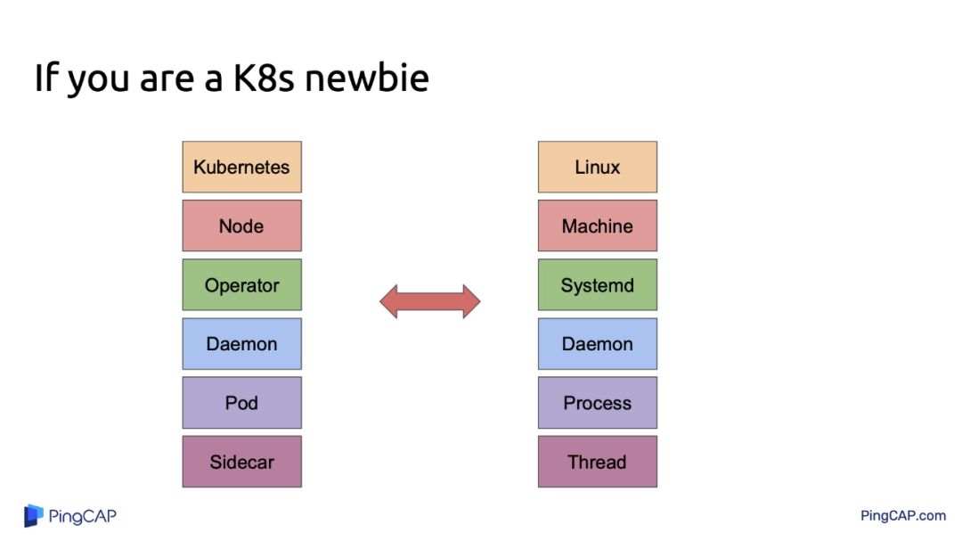 这是我们每隔 5 分钟 kill 掉一个节点的图,看起来 QPS 是这样的,最终都能回来。希望大家的线上系统看起来是这样,看起来还是正常的。接下来是比较难的一部分,很多人可能对 K8s 是什么不太清楚,其实 K8s 相当于是一个操作系统,node 是相当于一台机器,operator 是相当于 systemd,pod 相当于 process,sidecar 相当于 thread,最后一个需要一点时间来理解。