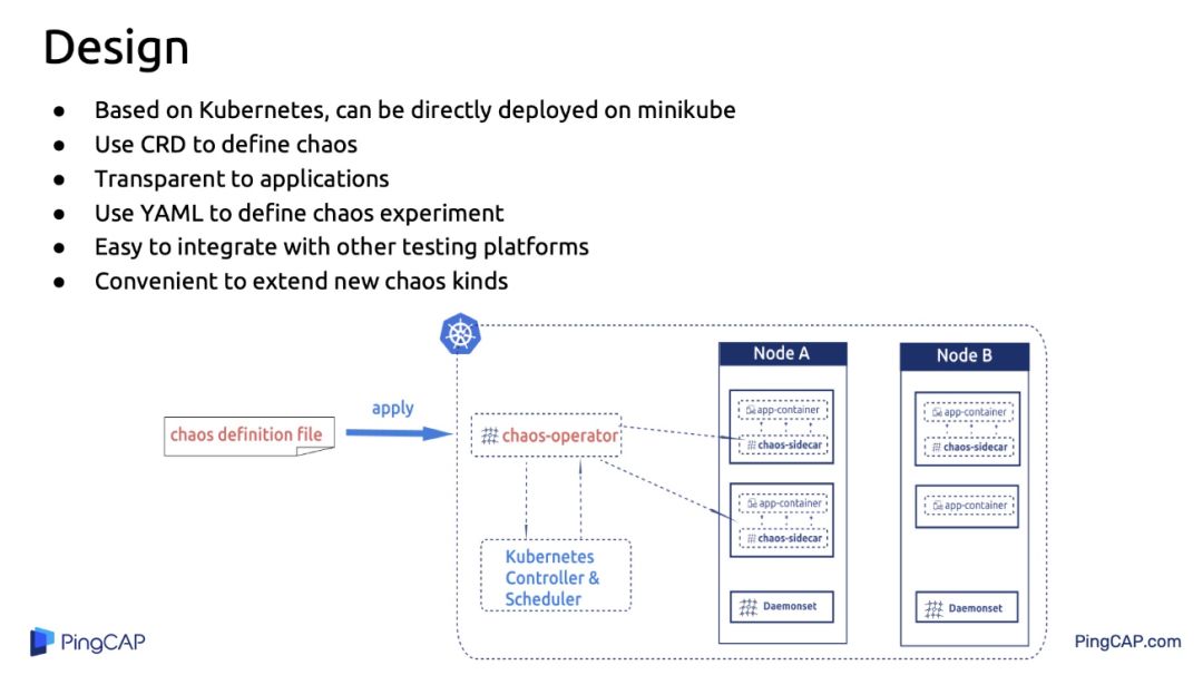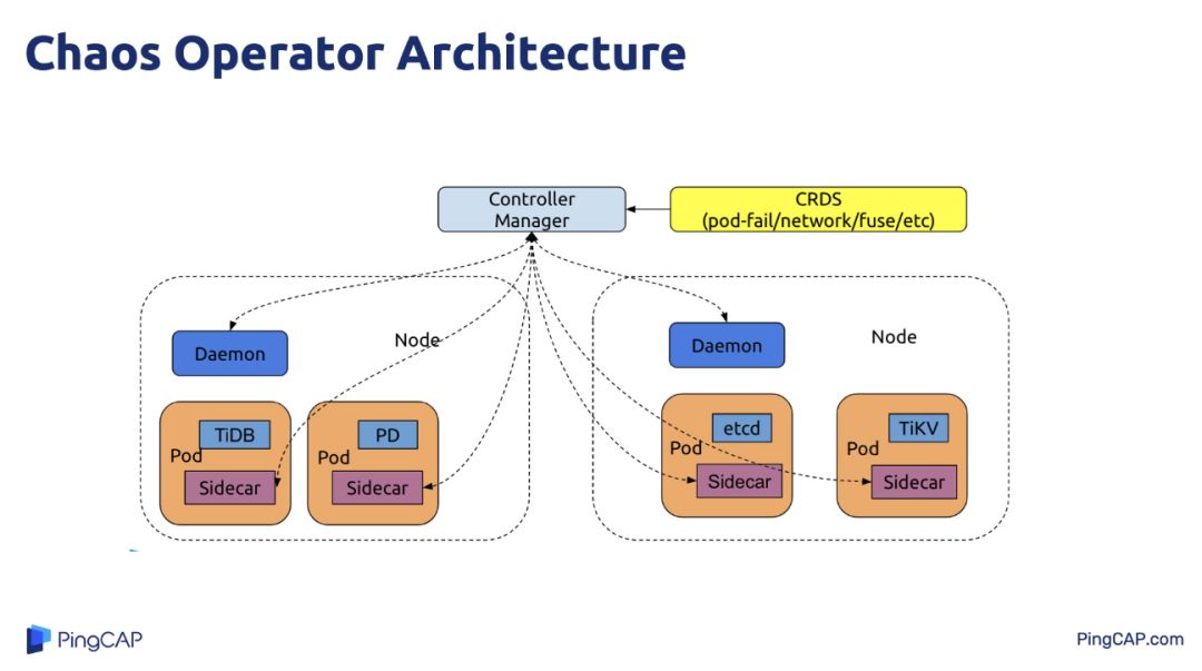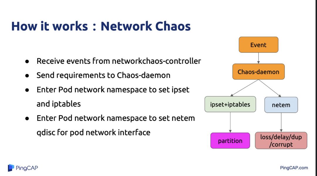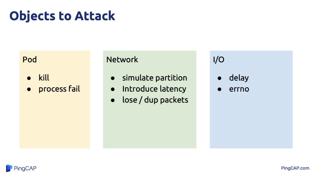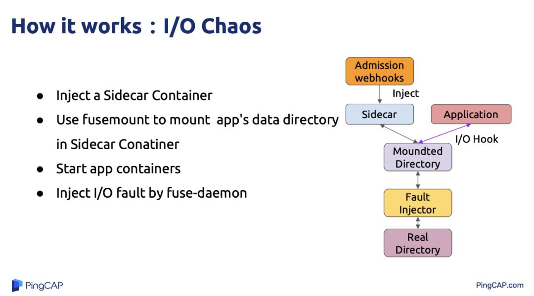 这是它的整个结构,重点看 CRD 里面,可以构造的几种常见的错误,像网络分区、网络丢包、网络重发、带宽限制等等。然后是文件系统,我们可以进行文件操作,写出来的数据和读出来的数据不一样。或者是写入失败,或者读取失败。Kubernetes 有 API Server,很好理解,你可以认为有 N 只猴子,每只猴子只做一件事,比如有一只猴子只做网络相关的,有一只就只做 I/O 相关的,本身都是 CRD。网络相关的使用的是 iptables,大家都知道 iptables 可以做网络上的各种操作,比如说隔离,比如说让数据只能进不能出等等,I/O 这边用的是 fuse。