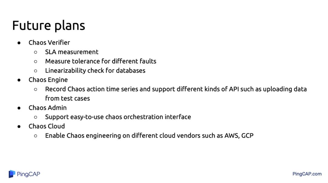 再来谈下未来的计划,我们未来计划有 verifier,verifier 这边可以添加更多的功能,比如我可以在某个时间点可以做什么操作,甚至我中间替换数据然后再去观察系统状态是不是不对。当然也会增加一个好看好用的界面,现在整个是通过命令行去操作的。另外也希望能够支持多云的错误注入,大家也不要假设云上的服务都是 OK 的。程序都是人写的,黑天鹅一定会出现的。