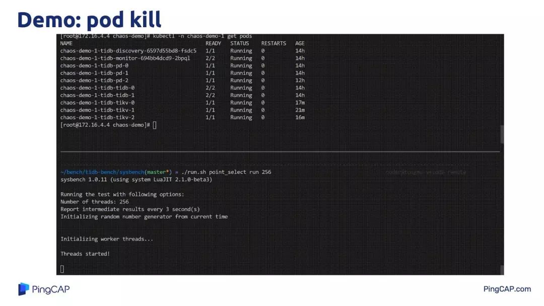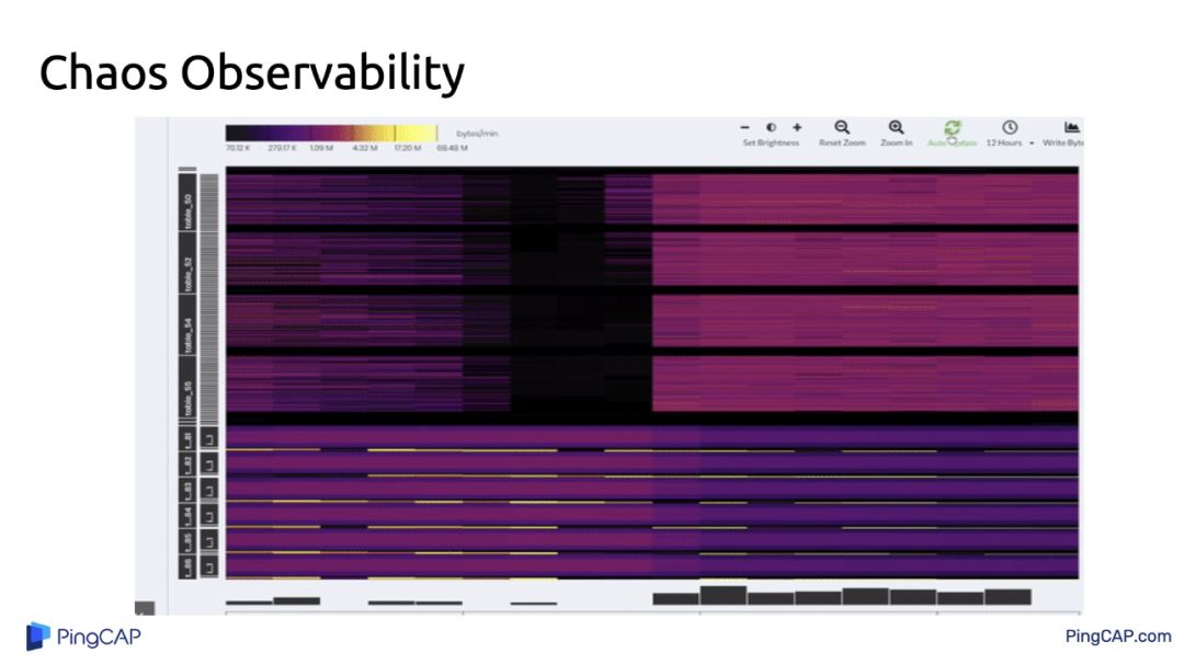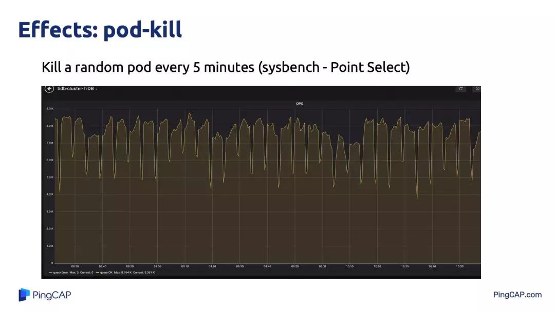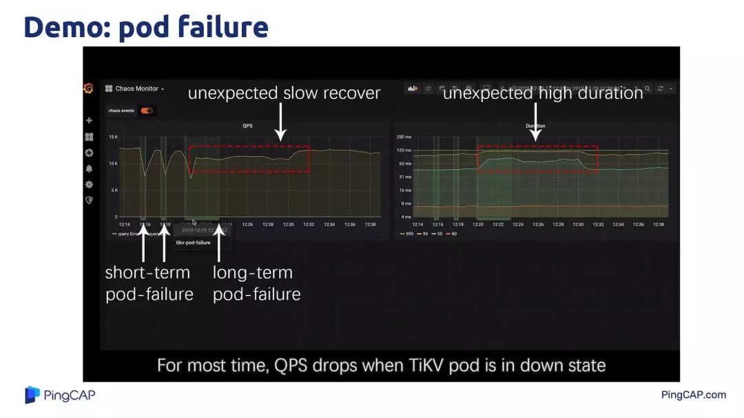 上图是一个 pod 跑数据库的过程,跑的过程中我们 kill 掉了前面大图里面的一个存储节点,我们的预期是 QPS 肯定会掉下来,后面会恢复。我们看起来好像是的,QPS 会掉 0,到 0 之后,大概过几秒钟好像又恢复了,看起来一切都正常。直到我们去观察整个系统的时候,会发现 QPS 的恢复花了相当长的一段时间,整个持续了大概有 10 分钟才恢复到正常值。我们的预期是 kill 掉之后很快应该能够恢复到正常值,但是它实际上没有做到。毫无疑问后来我们发现了一个 bug。