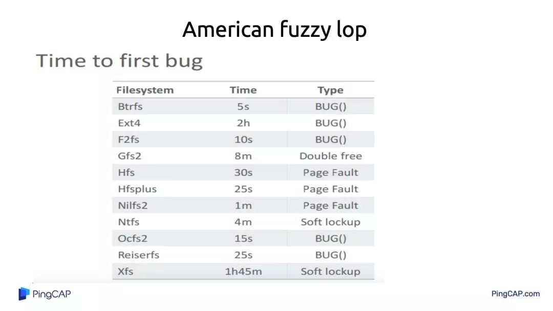 上图是我们遇到的一个操作系统 bug,我们后面还专门写了文章描述怎么找到这个 bug 的。大概意思是 Linux kernel 有一个 bug,明明有内存,但是内存分不出来,导致没法将 page cache 刷到磁盘上,丢失了数据。我想说的是操作系统 bug 离我们也挺近的,我们上面应用程序写得再好,后面也可能会在操作系统遇到问题。不过我们通常写程序的时候,这点考虑得比较少。大家都觉得文件系统很稳定,应该没有遇到过文件系统的 bug,大家以前也不知道文件系统有这么脆弱,直到有一个工具出现了:它最早用来找安全漏洞,后来被用来找其他的系统漏洞。我们拿着这个工具去测试一下已有的文件系统,下图是遇到第一个 bug 的时间。
