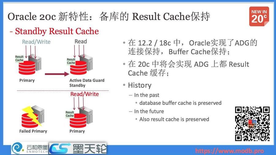 在Oracle12.2和18c中,已经实现了ADG的会话连接保持和Buffer Cache保持,在20c中,Result Cache在备库上进一步得以保留,以确保这个细节特性的主备性能通过。