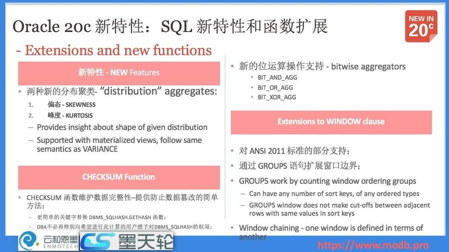在Oracle 20c中,关于SQL的函数扩展很多,包括对于ANSI 2011标准的部分支持,进一步的提升了SQL的处理能力。