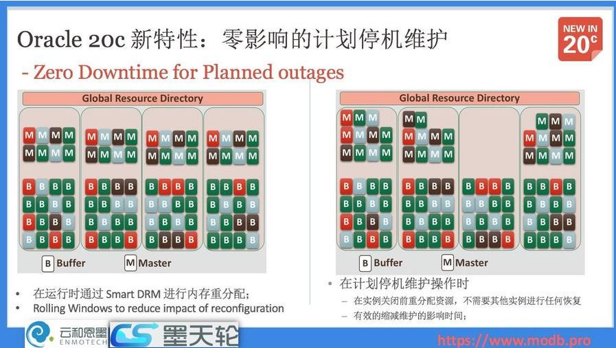 对于维护操作,数据库可以在实例关闭前进行动态的资源重分配,这一特性被称为Smart DRM,通过GRD的动态资源重组织,重新选出的Master节点不需要进行任何的恢复和维护,对于应用做到了完全无感知、无影响,