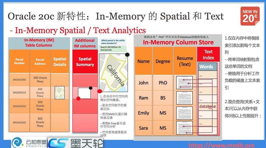针对Oracle数据库内置的多模特性,地理信息-Spatial和全文检索-Text组件,在20c中,通过In-Memory的内存特性,获得了进一步的支持。