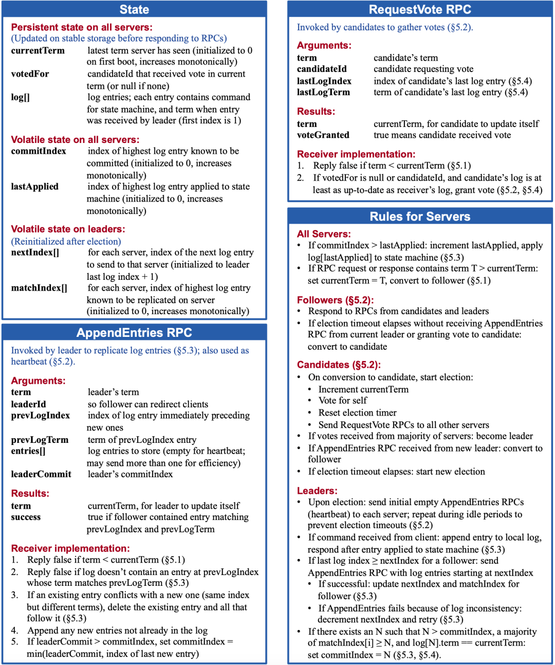 Figure 2: A condensed summary of the Raft consensus algorithm (excluding membership changes and log compaction). The server behavior in the upper-left box is described as a set of rules that trigger independently and repeatedly. Section numbers such as §5.2 indicate where particular features are discussed. A formal specification [31] describes the algorithm more precisely.