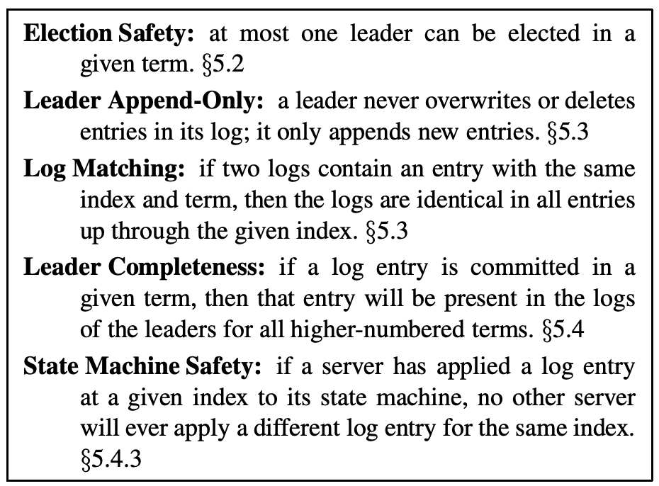 Figure 3: Raft guarantees that each of these properties is true at all times. The section numbers indicate where each property is discussed.