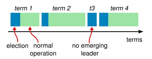 Figure 5: Time is divided into terms, and each term begins with an election. After a successful election, a single leader manages the cluster until the end of the term. Some elections fail, in which case the term ends without choosing a leader. The transitions between terms may be observed at different times on different servers.