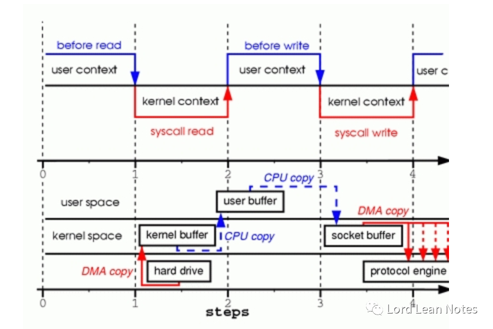 write函数的系统调用返回时,发生了上下文的第四次切换。这时DMA引擎将数据同步或者异步的的方式将数据复制到协议引擎