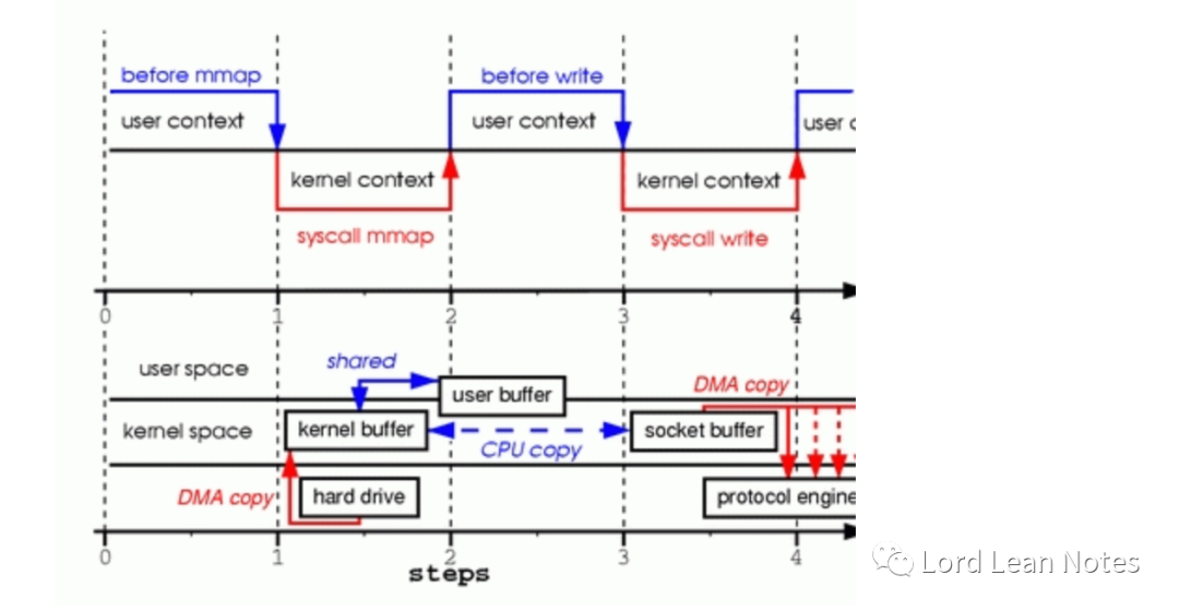 mmap函数的调用使文件从DMA引擎复制到内核缓冲区,而且该缓冲区与用户缓冲区共享,不会在内核态和用户态之间发生复制。