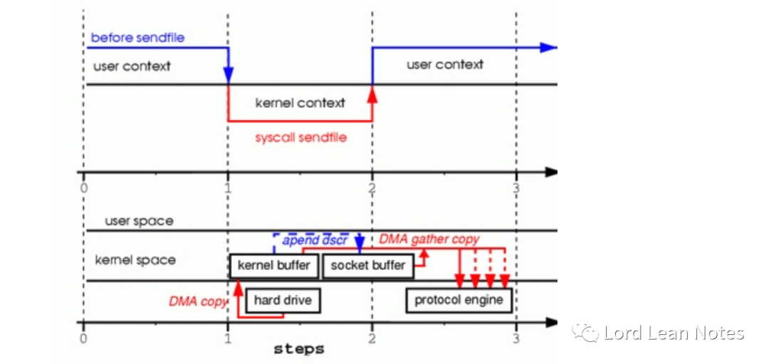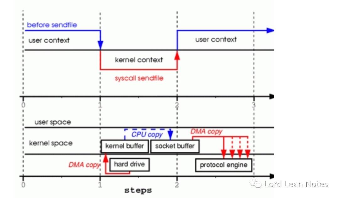 sendFile系统调用使文件内容被DMA引擎复制到内核缓冲区 没有数据被复制到套接字缓冲区。只有具有有关数据的位置和长度的信息描述符才能附加到套接字缓冲区。DMA引擎将数据直接从内核缓冲区传递到协议引擎。