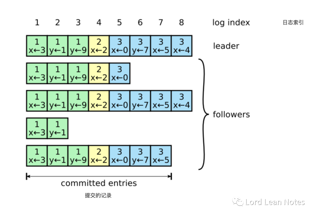 在正常操作期间,领导者和追随者的日志保持高度一致,然而领导者的崩溃会导致日志不一致的情况出现。比如下图: