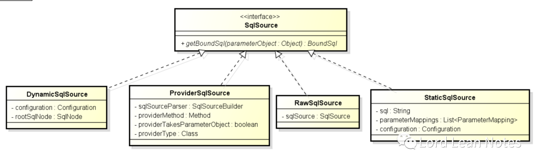 Sql源接口,代表从xml文件中或注解映射的sql语句内容,主要用于创建BoundSql。实现类有DynamicSqlSource(动态sql源)、StaticSqlSource(静态sql源)等。BoundSql类里面封装了mybatis最终产生的sql类,包括sql语句、参数、参数源数据等参数。