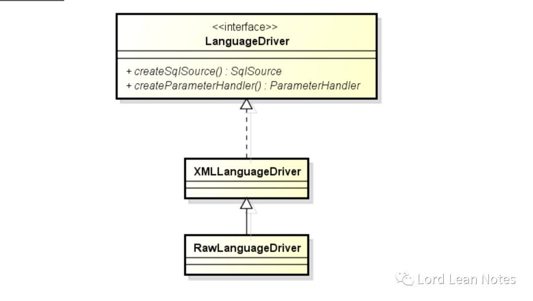 该接口的作用就是构造sql语句。我们可以看到这个接口有XMLLanguageDriver和RawLanguageDriver两个实现类。其中XMLLanguageDriver是处理xml文件中的sql,通过使用XMLScriptBuilder解析xml文件中的sql部分,而RawLanguageDriver则是处理静态sql。