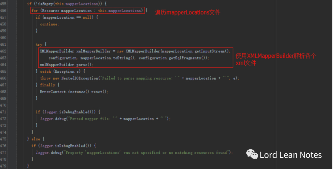 首先SqlSessionFactoryBean实现了Spring的InitializingBean接口,InitializingBean接口的afterPropertiesSet方法会调用buildSqlSessionFactory方法。buildSqlSessionFactory方法内部会使用XMLConfigBuilder解析属性是configLocation中配置的路径,还会使用XMLMapperBuilder解析mapperLocations属性中的各个xml文件。部分源码如下: