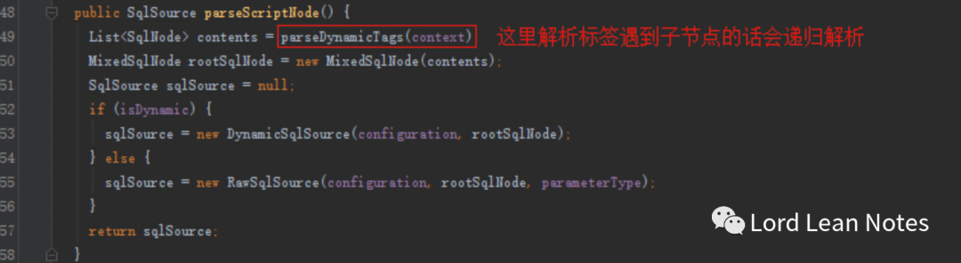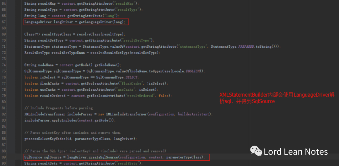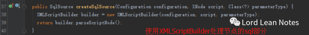 而在XMLStatementBuilder中会使用LanguageDriver来解析sql,并得到SqlSource对象。其默认会使用XMLanguageBuilder来创建SqlSource,并且使用XMLScriptBuilder来处理节点的sql部分。