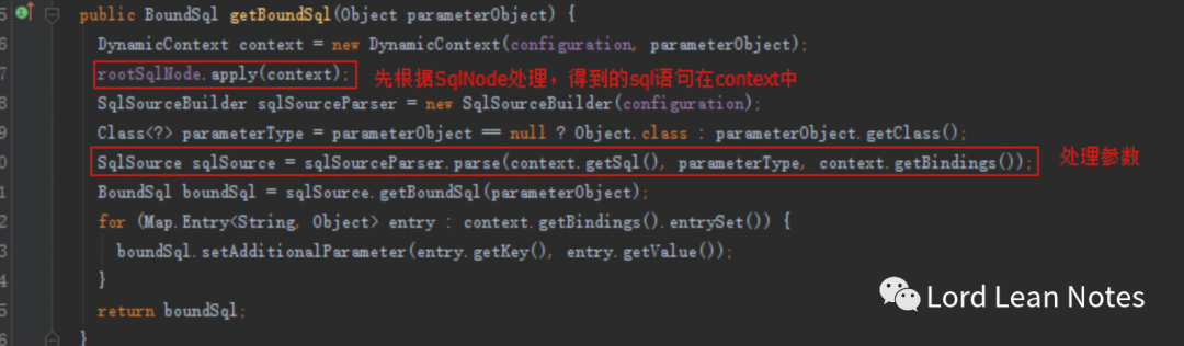 通过上面几张图可以看出在parseDynamicTags方法中解析子节点后会返回存储着所有sqlNode节点的集合,并把这个集合封装到了MixedSqlNode对象中。在获取BoundSql对象时,会遍历存储着所有sqlNode节点的集合,并调用apply方法,通过FilteredDynamicContext来过滤掉prefix和suffix。