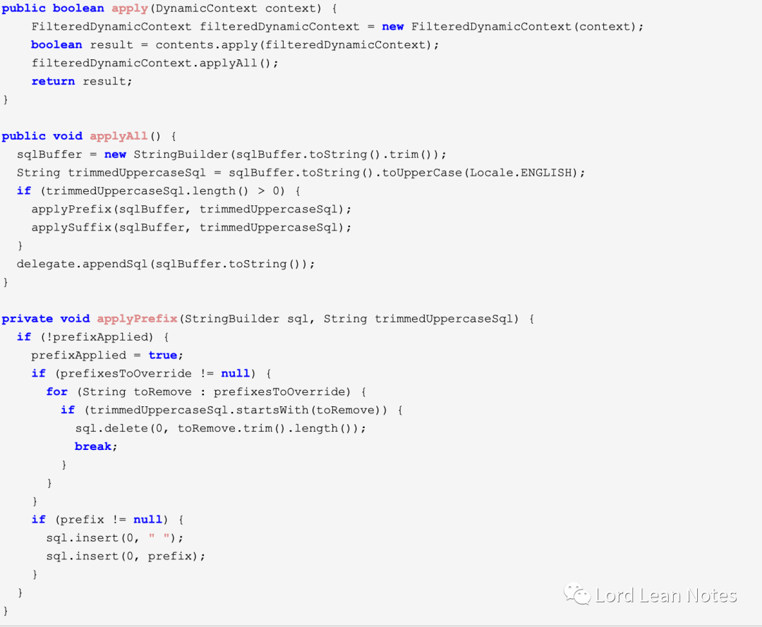 下面就拿TrimSqlNode节点来解析,看看其是怎么处理prefix和suffix内容的: