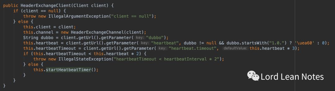 通过请求和响应的调用顺序图,我们可以看到consumer端是建立了长连接,最后的实现是在HeaderExchangeClient类,现在就让我们来看一下: