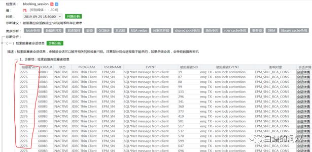 下面这个案例是2019年9月份的真实案例。是一个某系统因为应用BUG导致的行锁冲突及时消缺的典型案例。由于应用软件BUG导致某会话持有某个行锁不释放。导致大量会话因为等待行锁而被阻塞。如果该问题不能及时得到处置,则很可能出现大规模会话阻塞,甚至导致数据库会话达到参数极限,引起严重的系统故障。由于健康管理工具及时报警,现场人员快速定位,找到了未释放行锁的会话,及时杀掉该会话,恢复系统运行。故障处置完成时,业务部门还未感知。