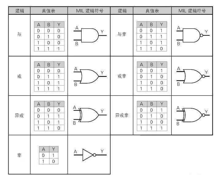 此时A端B端只要有一个是0V,那Y端就会和0V地方直接导通,导致Y端也变成0V。只有AB两端都是10V,Y和AB之间才没有电流流动,Y端也才是10V。我们把这个装置成为【与门】,把有电压的地方计为1,0电压的地方计为0。至于具体几V电压,那不重要。也就是AB必须同时输入1,输出端Y才是1;AB有一个是0,输出端Y就是0。其他还有【或门】【非门】和【异或门】,跟这个都差不多,或门就是输入有一个是1输出就是1,输入00则输入0。异或门难理解一些,不过也就那么回事,输入01或者10则输出1,输入00或者11则输出0。(即输入两个一样的值则输出0,输入两个不一样的值则输出1)。这几种门都可以用二极管做出来,具体怎么做就不演示了,有兴趣的童鞋可以自己试试。每次都画二极管也是个麻烦,我们就把门电路简化成下面几个符号。