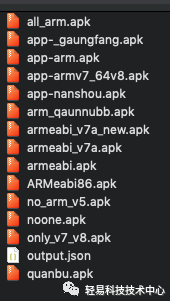 那能不能改成只支持 armeabi 或者 他们其中的部分呢。那就模拟这些情况,然后分别打出了这么多包(包的命名有点随意,这不是重点),分别在不同的手机上验证是否能正常加载 weex 。