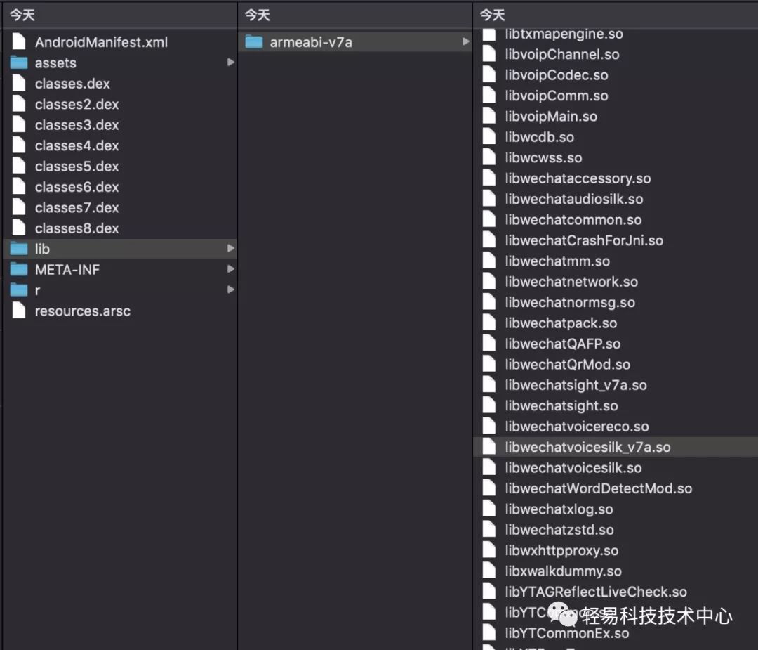 下图是微信的Apk 解压出的情况, 微信的lib下虽然只有armeabi-v7a一个目录,但目录内的文件仍放着v7a和 armeabi架构的SO文件,用于处理兼容带来的某些性能运算问题。