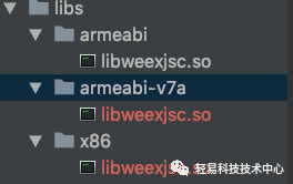 但是会向下兼容, 使用了 armeabi-v7a 中的文件,也没有报错,其实也是因祸得福,如果写正确的话,weex 在 arm64-v8a 也会加载失败,因为 官方也没有提供这样的一个文件夹和文件。