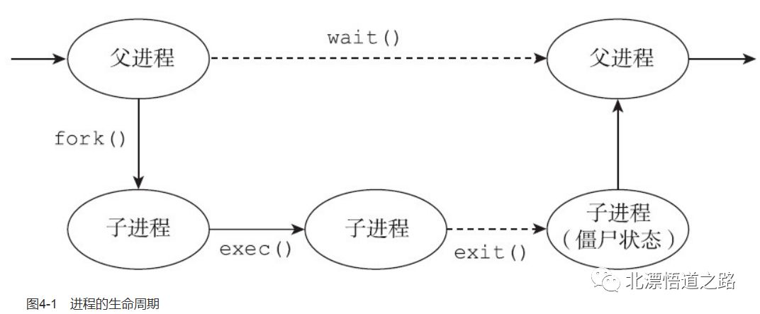 通过fork 进程,子进程继承安全性身份,过去和当前的文件描述符、端口和资源特权、环境变量,以及进程代码。随后子进程可能exec其自己的程序代码。通常,父进程的子进程运行期间处于睡眠状态,设置一个在子进程完成时发出信号的请求(wait).在退出时,子进程可能已经关闭或丢弃了其资源和环境;剩余的部分称为僵停。父进程在子进程退出时收到信号而被唤醒,清理剩余的结构,然后继续执行其自己的程序代码。