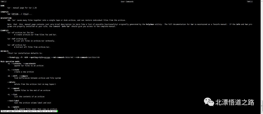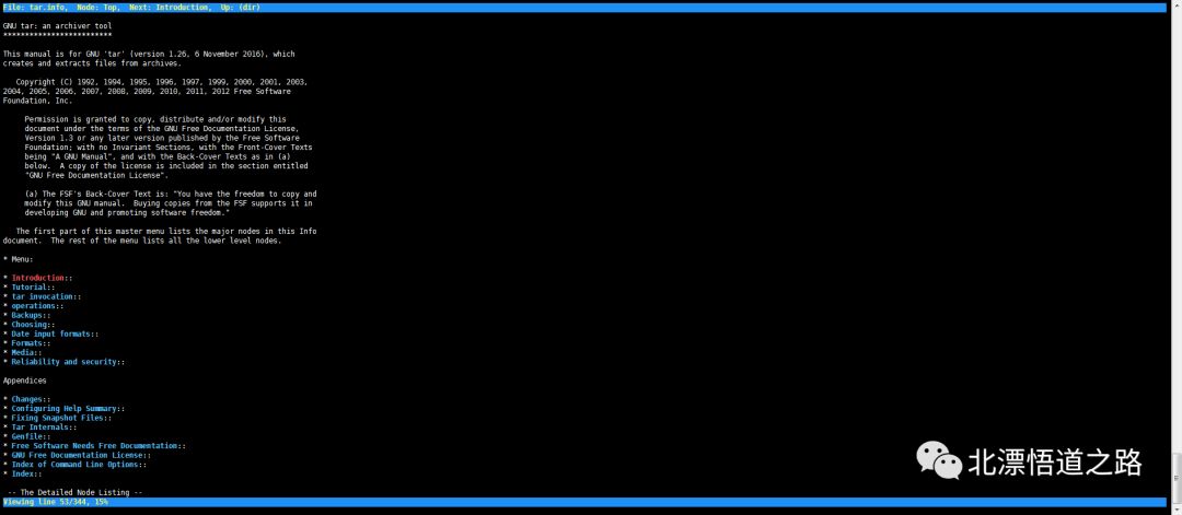 一些命令和实用工具同时拥有 man page 和 info 文档;通常而言,info 文档的内容将更加深入。使用man 和 pinfo 比较tar 文档中的区别: