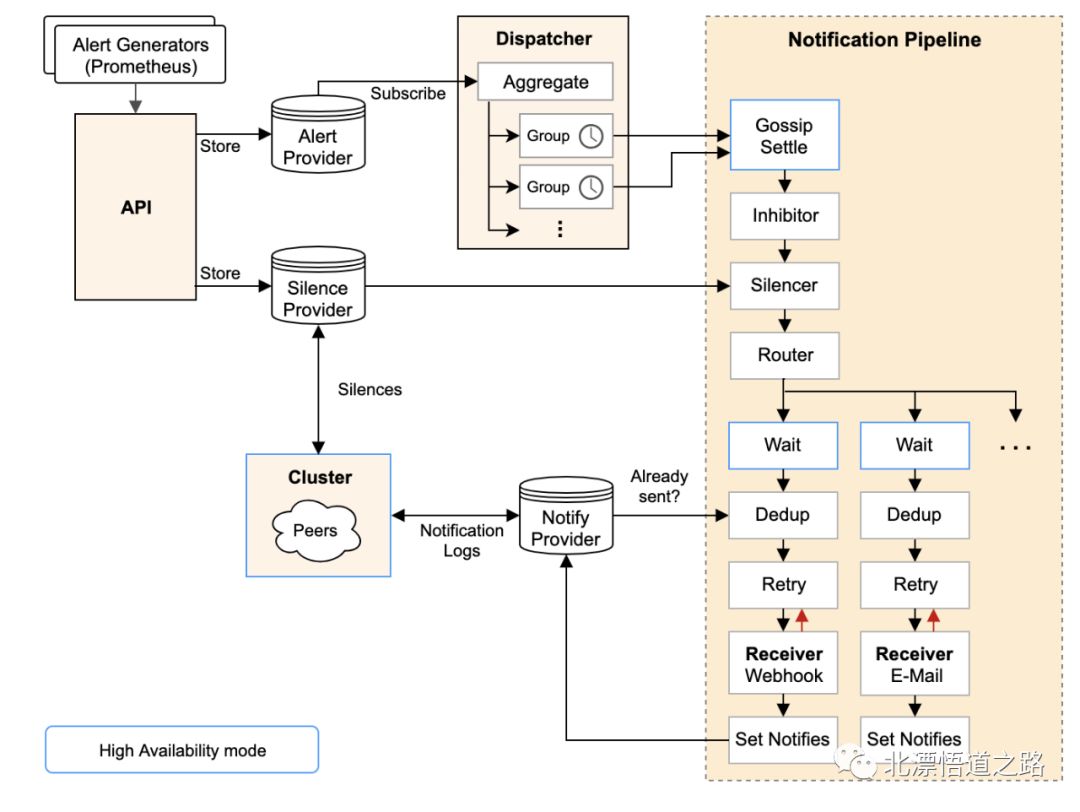 在高可用的架构中,每个Prometheus都会配置多个AlertManager,避免单点故障,具体的流程如下: