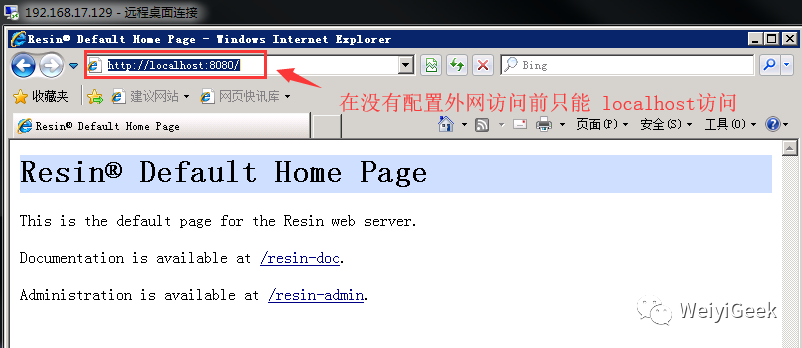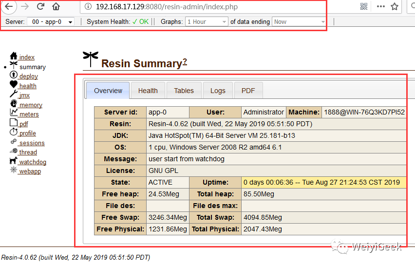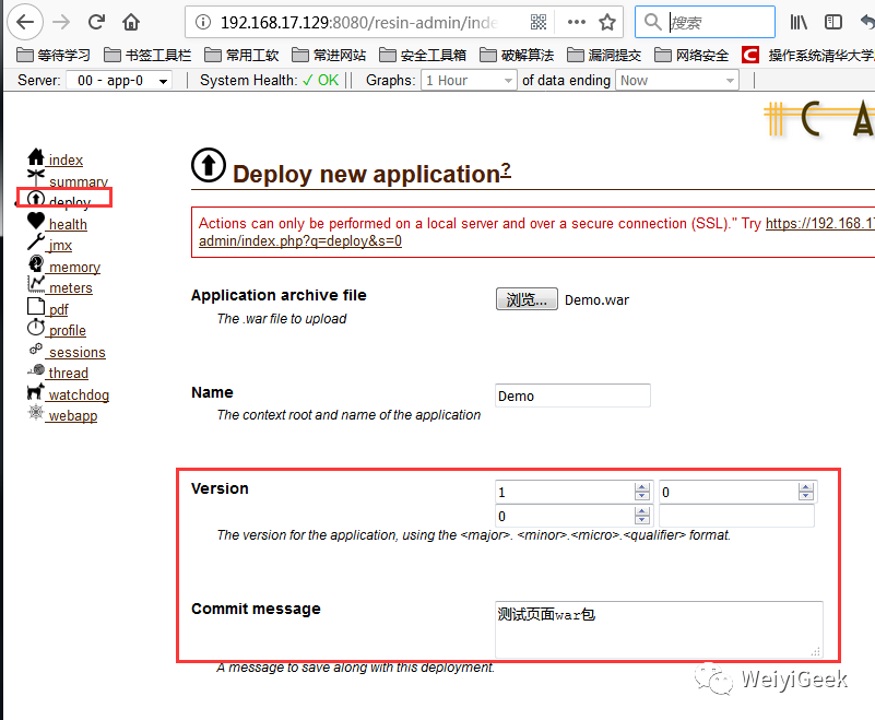 #方式1把war文件放进resin目录中的webapps下,然后resin自动解压,这样虽然可以但是可能会遇到很多问题,就比如运行的时候找不到js文件了,报404,又或者找不到配置的文件或者action。#方式2:在resin目录中的conf中的resin.conf,这个文件是resin自带的,打开这个文件,拉到底下找到<web-app>这个标签,然后把原本的<web-app id="/" root-directory="">注释掉,添加下面一句<web-app id="/" document-directory="D:\test\**" archive-path="D:\test\**.war"/>#方式3:通过resin-admin后台进行部署(注意需要开启ssl)Actions can only be performed on a local server and over a secure connection (SSL)." Try https://192.168.17.129:8443/resin-admin/index.php?q=deploy&s=0访问网站:https://192.168.17.129:8443/Demo-1.1.0/Hello World!WeiyiGeek