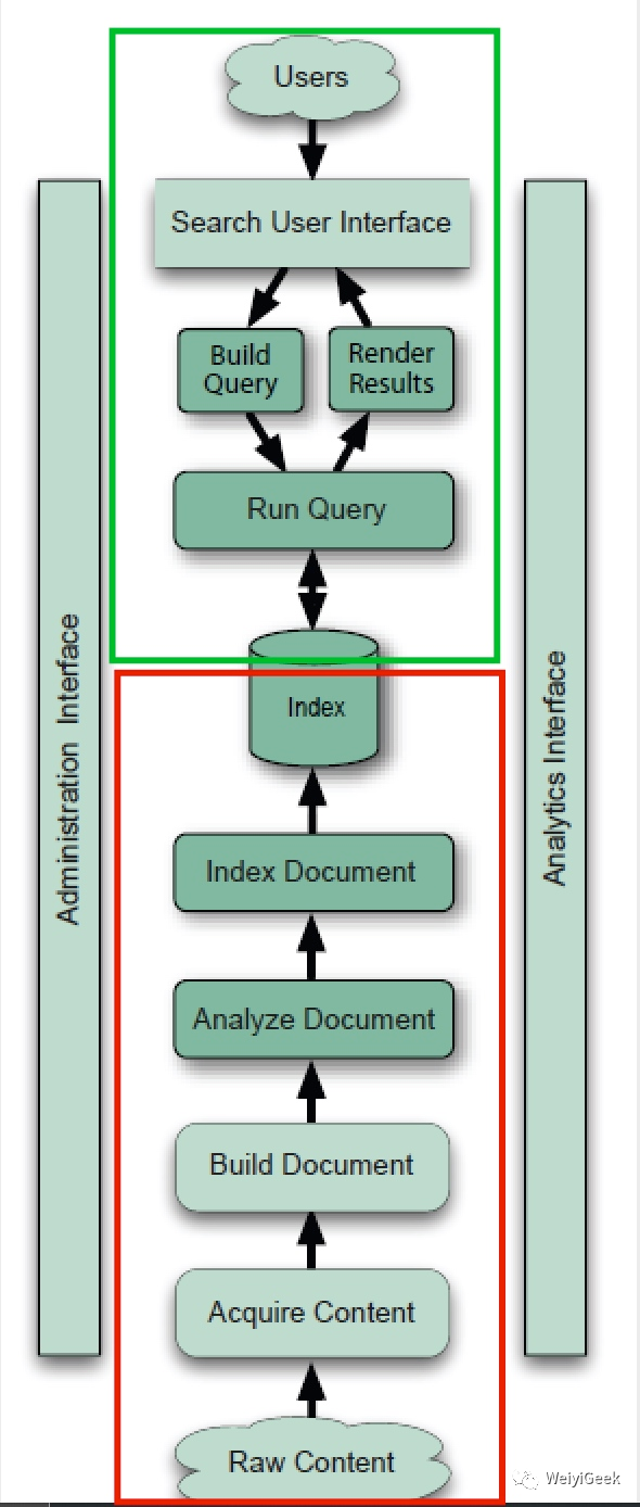 索引组件: 获取数据Acquire Content–>建立文档Build Document–>文档分析Analyze Document–>文档索引(Index Document)。