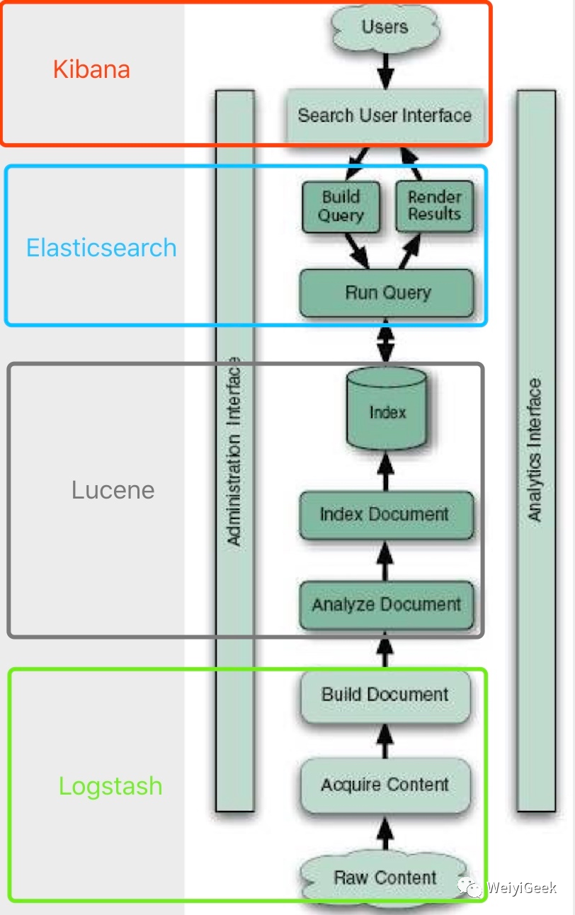 Logstash组件来代替原始内容(Raw Content)和获取内容(Acquire Content)及构建文档(Build Document)的功能,(也可以使用程序直接往ES里面写入数据)。