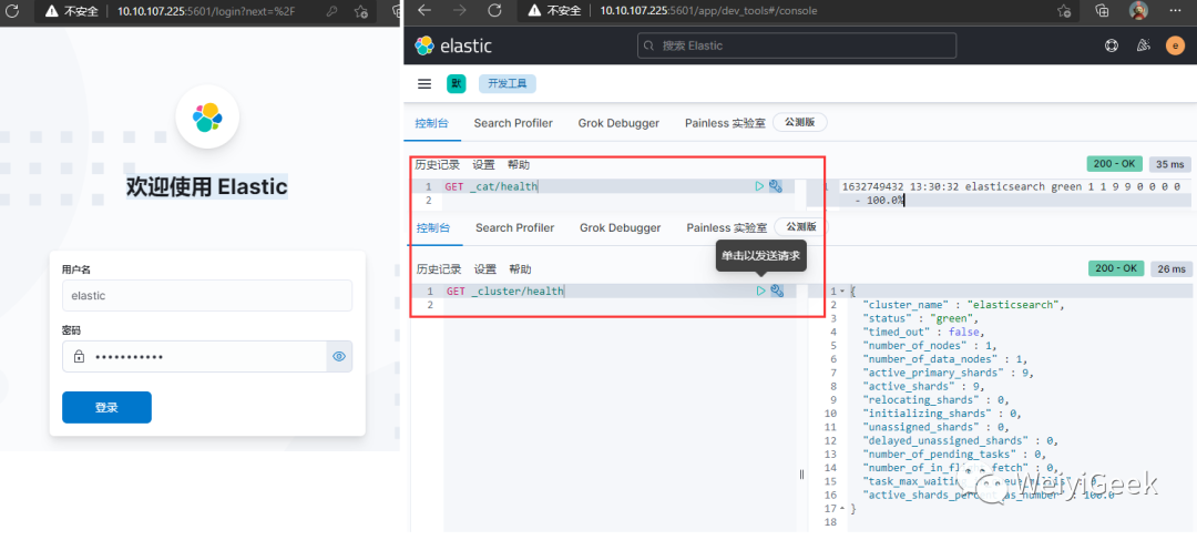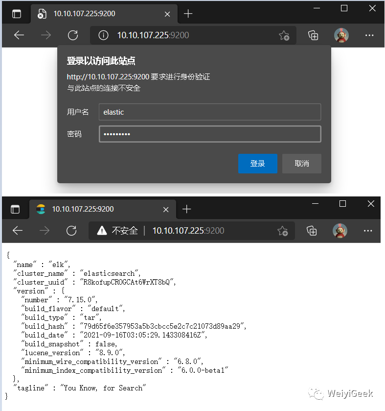 elk@elk1:/usr/local/kibana-7.15.0/config$ grep -E -v "^#|^$" kibana.ymlserver.port: 5601server.host: "0.0.0.0"server.name: "ES-kibana"elasticsearch.hosts: ["http://10.10.107.225:9200"]kibana.index: ".kibana"elasticsearch.username: "kibana_system"elasticsearch.password: "weiyigeek"elasticsearch.pingTimeout: 1500i18n.locale: "zh-CN"